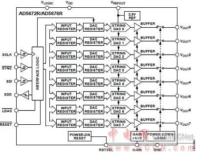 AD5672R/AD5676R采用多功能串行外設(shè)接口(SPI),時(shí)鐘速率最高達(dá)50 MHz,并均包含一個(gè)為1.8 V/3 V/5 V邏輯電平準(zhǔn)備的VLOGIC引腳。