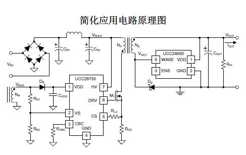 現(xiàn)有初級側穩(wěn)壓電源的主要設計局限在于如何在保持低待機功率的情況下,仍保證較高的瞬變響應性能。UCC28730和UCC24650芯片集在盡可能提供最佳瞬變響應性能的同時,實現(xiàn)了零待機功耗。其中UCC24650不僅免除對光耦合器件和TL431等回饋組件的需要,從而降低了成本,而且其內(nèi)置喚醒控制器中的TI電壓偏低檢測功能還在保持窄輸出電壓穩(wěn)壓窗口(支持零到滿負載瞬變)的情況下,還可以應用微型輸出電容器。