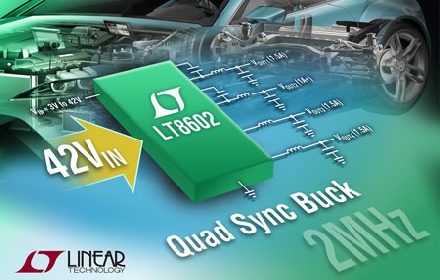 Linear推出可達(dá) 42V 輸入、高效率、四輸出同步單片降壓型開關(guān)穩(wěn)壓器 LT8602。該器件的 4 通道設(shè)計(jì)整合了高壓 2.5A 和 1.5A 兩個(gè)通道以及兩個(gè)較低電壓的 1.8A 通道,以提供 4 路獨(dú)立輸出,從而可提供低至 0.8V 的電壓。其同步整流拓?fù)涮峁└哌_(dá) 93% 的效率,同時(shí)突發(fā)模式 (Burst Mode®) 工作在無負(fù)載備用情況下保持靜態(tài)電流低于 30µA (所有通道),從而使該器件非常適合始終保持接通的系統(tǒng)。就噪聲敏感型應(yīng)用而言,LT8602 運(yùn)用其脈沖跳躍模式工作以最大限度降低開關(guān)噪聲,并滿足 CISPR25 Class 5 EMI 要求。開關(guān)頻率可設(shè)定在 250kHz 至 2.2MHz 范圍,并可在這個(gè)范圍內(nèi)同步。