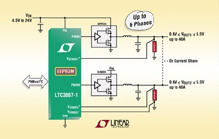 LTC3887-1 調(diào)節(jié)兩個獨立的輸出,也可針對一個 0.5V 至 5.5V 的兩相單路輸出進行配置。最多可交錯和并聯(lián) 6 相以在多個 IC 之間實現(xiàn)準確的均流,從而最大限度地降低高電流或多輸出應用的輸入和輸出濾波要求。一個集成的放大器提供了真正的遠端差分輸出電壓檢測,從而可不受電路板 IR 壓降影響以實現(xiàn)高準確度調(diào)節(jié)。應用包括電信、數(shù)據(jù)通信、計算和存儲市場所需的大電流 ASIC、FPGA 及處理器電源。