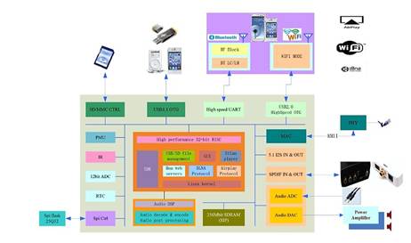 該芯片集成了2.0 High SpeedUSB控制器(內(nèi)置PHY), SD/MMC/SDIO控制器,100M以太網(wǎng),高速UART,Audio ADC和DAC,5.1 I2Sin/out和SPDIF in/out等音頻接口,內(nèi)置了RTC,A/D模塊和UART/SPI Master/I2C/PWM接口,并采用先進(jìn)的SMIC 0.11G工藝,100-PIN LQFP封裝,疊封SDRAM,非常適合音樂(lè)播放、無(wú)線推送和音效處理等多方面的應(yīng)用。應(yīng)用信息如下圖所示: