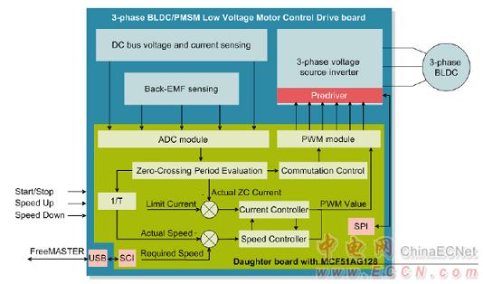 采用MCF51AG128無(wú)傳感器三相BLDC馬達(dá)演示板
