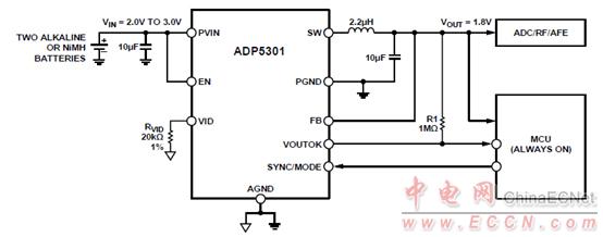 圖2.采用兩節(jié)堿性電池/NiMH電池ADP5301應用電路圖