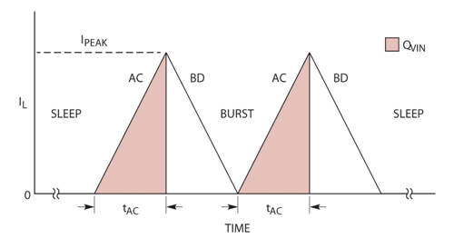 開關 A 和 C 在每個突發(fā)周期開始時接通。電感器電流斜坡上升至 Ipeak,然后開關 A 和 C 斷開。接著,開關 B 和 D 接通,直到電感器電流斜坡下降至零為止。這個周期一直重復,直至 Vout 達到休眠門限為止。如果 Ipeak 和開關 AC(ON) 時間 (tAC) 都是已知的,那么 BAT 放電庫侖量 (圖 3 中的陰影區(qū)域) 可以通過對 AC(ON) 周期計數(shù)并乘以每個 AC(ON) 期間的電荷量來計算,每個 AC(ON) 期間的電荷量由以下公式給出: