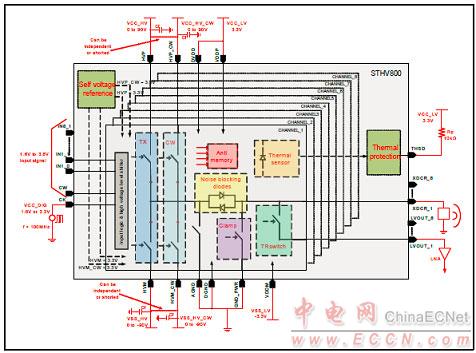 ST公司的STHV800是大容量超聲波發(fā)送器,每路有兩個獨(dú)立的半橋,輸出電壓0- ±90 V,輸出電流±2 A,由外部時鐘可同步輸入信號,工作頻率高達(dá)20MHz,主要用在醫(yī)用超聲波圖像,脈沖波形發(fā)生器,NDT超聲波發(fā)送,壓電變送器驅(qū)動等.本文介紹了超聲波系統(tǒng)框圖,STHV800主要特性,內(nèi)部框圖,評估板STEVAL-IME009V1主要特性,硬件框圖,電路圖和材料清單.
