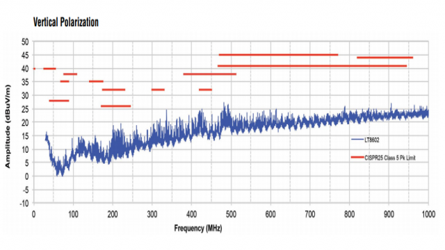 就噪聲敏感型應用而言,LT8602 加上一個小型外部濾波器,就可以運用其脈沖跳躍模式最大限度降低開關(guān)噪聲,且可滿足 CISPR25 Class 5 EMI 要求,如圖 2 所示。