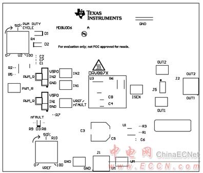 圖5.評(píng)估模塊DRV8872EVM PCB元件布局圖 |