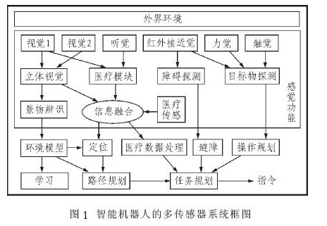 覺、觸覺等外部傳感器和機器人各關(guān)節(jié)的內(nèi)部傳感器信息融合使用,可使機器人完成實時圖像傳輸、語音識別、景物辨別、定位、自動避障、目標物探測等重要功能;給機器人加上相關(guān)的醫(yī)療模塊(CCD、CAMERA、立體麥克風、圖像采集卡等)和專用醫(yī)療傳感器部件,再加上醫(yī)療專家系統(tǒng)就可以實現(xiàn)醫(yī)療保健和遠程醫(yī)療監(jiān)護功能。智能機器人的多傳感器系統(tǒng)框圖如圖1所示。
