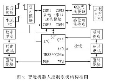 控制系統(tǒng)以DSP(TMS320C54x)為核心部件,由藍牙無線通信、GSM無線通信(支持GPRS)、電機驅(qū)動、數(shù)字羅盤、感覺功能傳感器(視覺和聽覺等)、醫(yī)療傳感器和多選一串口通信(RS-232)模塊等組成,控制系統(tǒng)框圖如圖2所示。
