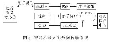 在智能機器人上安裝1個帶有藍牙模塊的探測器作為接收設(shè)備,各種醫(yī)療傳感器將采集到的生理信息數(shù)據(jù)通過藍牙模塊傳輸?shù)教綔y器,探測器有2種工作方式:一是將數(shù)據(jù)交給智能機器人處理,提供本地結(jié)果;二是與Internet連接(也可以通過GSM無線模塊直接發(fā)回),通過網(wǎng)絡(luò)將數(shù)據(jù)傳輸?shù)竭h程醫(yī)療中心,達到醫(yī)療保健與遠程監(jiān)護的目的。視頻和音頻數(shù)據(jù)的傳輸也采用這種方式。智能機器人的數(shù)據(jù)傳輸系統(tǒng)如圖4所示。