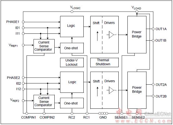 H橋功率級由非重疊信號控制,可以在切換電流方向時防止電流交叉?zhèn)鲗?dǎo)。內(nèi)部箝位二極管可以保護(hù)器件免遭感應(yīng)瞬變的傷害。