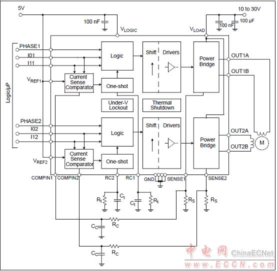 全、半和微步進(jìn)操作可以利用PWM電流控制和邏輯輸入來實現(xiàn)。最高輸出電流取決于感應(yīng)電阻和用戶可選參考電壓。輸出電流限制可以利用2個邏輯電平輸入進(jìn)行選擇?蛇x輸出電流限制為最高輸出電流的0%、33%、67%或100%。每個電橋都具有PHASE輸入信號,可用于控制流過H橋和負(fù)載的電流方向。