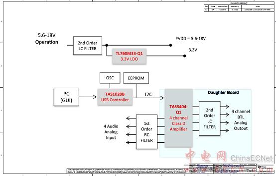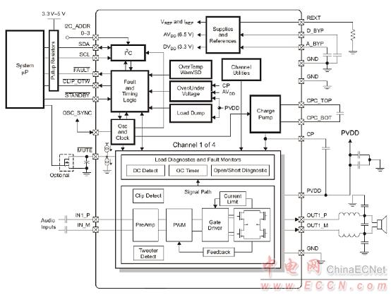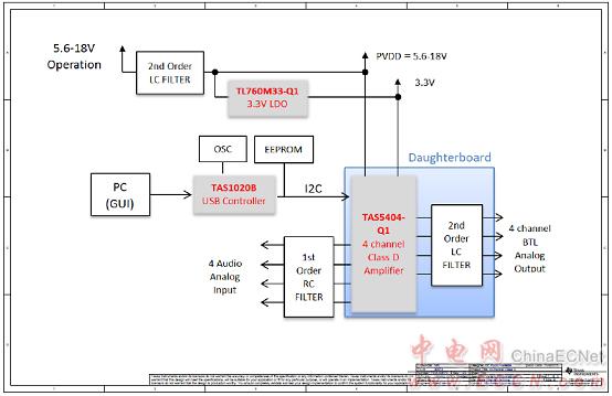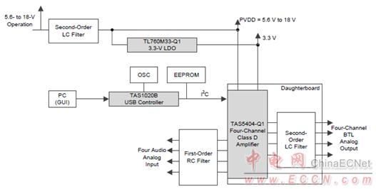 圖4.汽車四路D類放大器參考設(shè)計TIDA-00573框圖