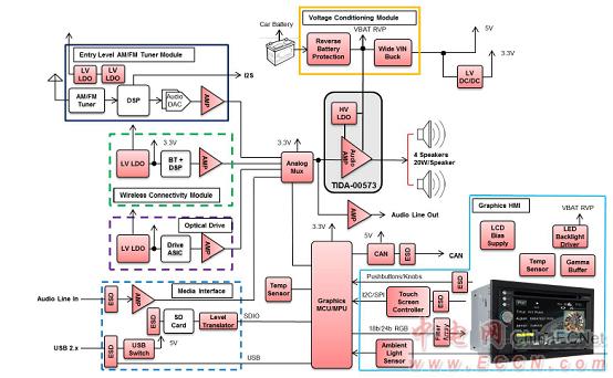 圖5.集成了TIDA-00573的汽車音響主機框圖