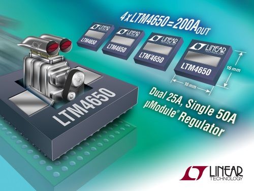 | 凌力爾特公司 (Linear Technology Corporation) 推出雙輸出25A或單輸出 50A 降壓型微型模塊 (μModule) 穩(wěn)壓器LTM4650,該器件內(nèi)置了屏蔽的電感器、MOSFET和兩個(gè)DC/DC穩(wěn)壓器IC,全放在一個(gè)小型耐熱性能增強(qiáng)型塑料封裝中。該器件采用16mm x 16mm x 5.01mm BGA封裝,內(nèi)置了已獲專利的散熱器。該散熱器連接到MOSFET和電感器上,可從封裝內(nèi)部到封裝頂部快速散出熱量,而散熱器的表面則裸露于空氣中。通過空氣流動(dòng)或者空氣流動(dòng)加上連接外部散熱器,散熱性能可得到進(jìn)一步提高。當(dāng)沒有外部散熱器的情況下,在環(huán)境溫度高達(dá)71℃和200LFM氣流或環(huán)境溫度高達(dá)77℃和400LFM氣流時(shí), LTM4650可從12VIN至0.9VOUT提供50A電流。