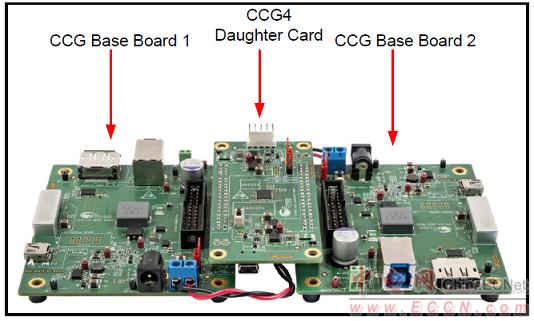 Two CCG EVK base boards assembled with one CCG4 daughter card