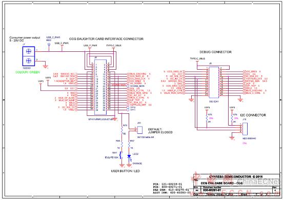 The CCG base board consists of a DC input power supply, a display multiplexer, a DisplayPort connector, a SuperSpeed Type-B port, and a Type-C port. The CCG4 daughter card consists of the CCG4 device and a USB-Serial IC to provide aUSB interface for debugging. CCG4‘s CC lines of the respective Type-C interface are connected to the Type-C port on the CCG base board. CCG4 controls the display multiplexer over an I2C interface.
