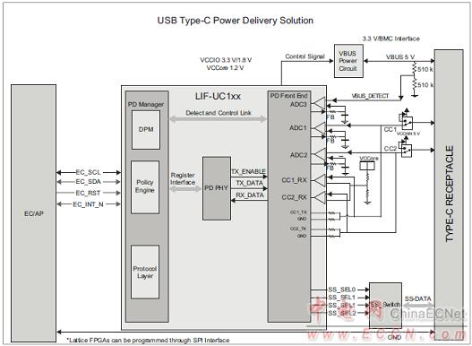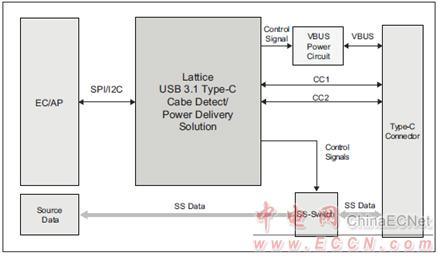The Lattice USB Type-C solution is designed to provide bidirectional configuration channel signals (CC1/CC2) to the Type-C connector. The solution also provides VBUS power circuitry control signal and Super- Speed (SS) switch control signals.