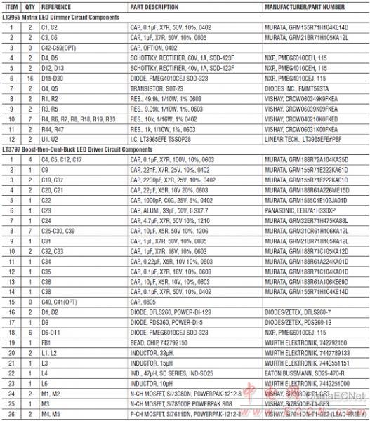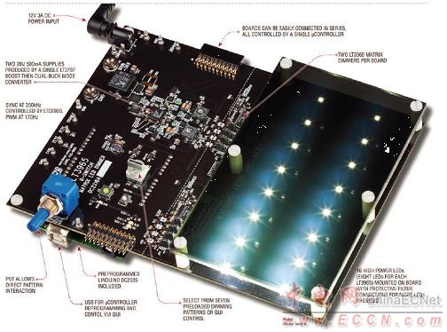 Linear公司的LT3965是八開關(guān)矩陣LED調(diào)光器,具有八個單獨控制的17V/330mΩ NMOS開關(guān),八個開關(guān)可并聯(lián)/或串聯(lián),采用I2C串口和MCU通信,每個開關(guān)可單獨開/關(guān)/調(diào)光1-4個LED,數(shù)字可編程256:1 PWM調(diào)光,主要用在汽車LED頭燈,大型LED顯示屏,自動照相機閃光設(shè)備,RGBW彩色混合照明.本文介紹了LT3965主要特性,框圖和幾種應(yīng)用電路,以及演示板DC2218A特性,測試建立圖,電路圖,材料清單和PCB元件布局圖.