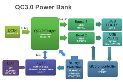 移動電源輸入除適用一般5V適配器外,最大特點是支持QC3.0適配器,讓移動電源本身電池也具備快充功能,最大充電電流更高達(dá)4.5A,可于半小時內(nèi)讓移動電源充電達(dá)80%電量。系統(tǒng)中MCU內(nèi)建程序包含充、放電燈號顯示、電量顯示與相關(guān)保護(hù)功能。
