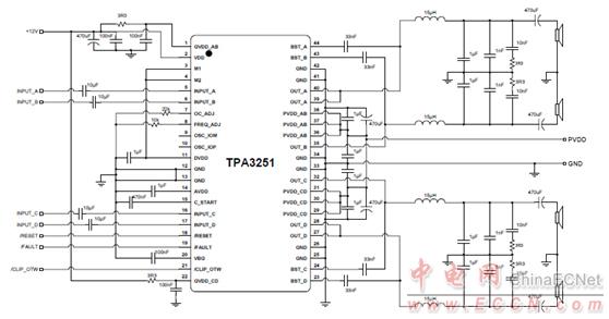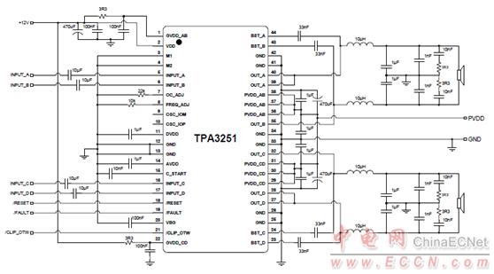 圖3.TPA3251差分輸入BTL應用電路圖