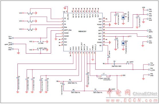Cypress公司的MB39C831是高效率同步整流升壓DC/DC轉(zhuǎn)換器,包括控制DC/DC轉(zhuǎn)換器輸出跟隨太陽能電池的MPPT和鋰電池安全充電的保護功能,輸入電壓0.3V 到 4.75V,輸出電壓調(diào)整范圍3.0V到5.0V,無負載時的靜態(tài)電流41μA,主要用在太陽能收獲,熱能收獲,手持音頻播放器,手機,電子書,電子詞典,無線遙控控制器和傳感器節(jié)點.本文介紹了MB39C831主要特性,框圖,恒壓模式和充電模式應(yīng)用電路,以及評估板MB39C831-EVB-03主要指標,框圖,電路圖,材料清單和PCB設(shè)計圖.