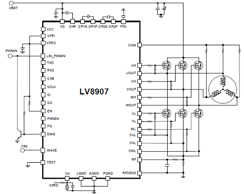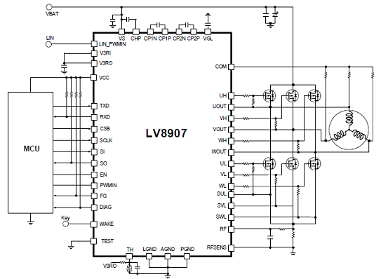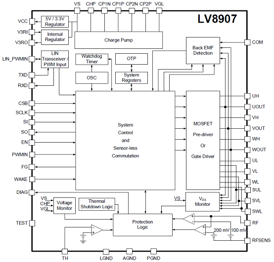 The LV8907 is a high performance, AEC-Q100 qualified, sensor-less three-phase BLDC motor controller with integrated gate drivers for driving external N-MOSFETs. An on-chip two-stage charge pump provides required gate voltage for a wide range of low RDS(ON) type external N-MOSFETs. The device offers a rich set of system protection and diagnostic functions such as over-current, over-voltage, short-circuit, under-voltage, over-temperature and many more. It supports open-loop as well as closed-loop speed control with user configurable startup, speed setting and proportional/integral (PI) control coefficients, making it suitable for a wide range of motor and load combinations. With a built-in linear regulator for powering external circuits, a watchdog timer, and a LIN (Local Interconnect Network) transceiver, the LV8907 offers a very small system solution. The LV8907 stores system parameters in embedded one-time programmable (OTP) non-volatile memory in addition to RAM system memory. An SPI interface is provided for parameter setting and monitoring the system status. With the operating junction temperature tolerance up to 175ºC and electrically LIN compatible control signals (PWM and Enable), the LV8907 is an ideal solution for stand-alone BLDC motor control systems.