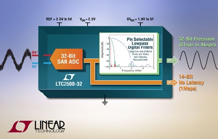 凌力爾特公司 (Linear Technology Corporation) 推出超高精度 32 位逐次逼近寄存器 (SAR)型模數(shù)轉(zhuǎn)換器 (ADC) LTC2508-32。許多高性能應(yīng)用 (包括數(shù)據(jù)采集、工業(yè)控制和醫(yī)療儀表) 均要求準(zhǔn)確度和速度。這通常是通過在同一個(gè)系統(tǒng)中采用一個(gè)高分辨率 ΔΣ ADC 和一個(gè)高速 SAR ADC 來實(shí)現(xiàn)。LTC2508-32 通過同時(shí)提供一個(gè) 32 位低噪聲數(shù)字濾波輸出和一個(gè) 14 位 1Msps 無延遲輸出簡化了此類混合 ADC 系統(tǒng)設(shè)計(jì)。由于這些輸出是從單個(gè) 32 位 SAR ADC 內(nèi)核產(chǎn)生,因此高準(zhǔn)確度和高速輸出是完全匹配的,即使當(dāng)工作溫度、電源和應(yīng)力變化時(shí)也不例外。與使用兩個(gè)極度不匹配 ADC 的傳統(tǒng)解決方案截然不同,LTC2508-32 中準(zhǔn)確度和速度的獨(dú)特組合實(shí)現(xiàn)了高得多的系統(tǒng)性能,同時(shí)縮小了解決方案尺寸并減少了組件數(shù)目。