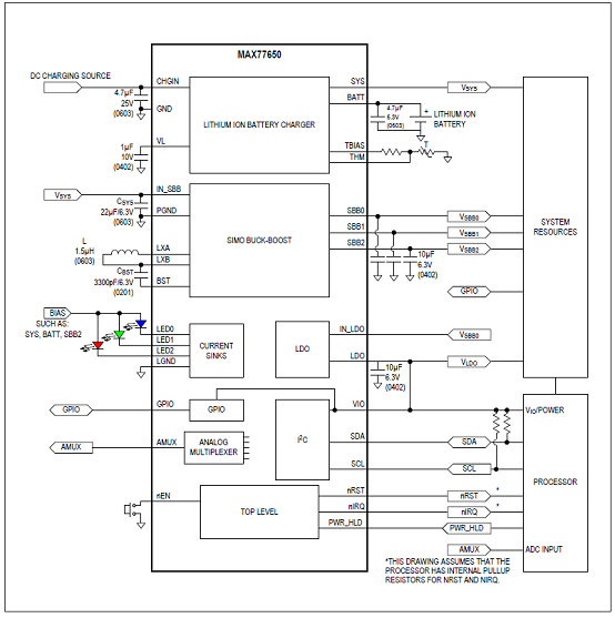 The MAX77650/MAX77651 provide highly-integrated battery charging and power supply solutions for low-power wearable applications where size and efficiency are critical. Both devices feature a SIMO buck-boost regulator that provides three independently programmable power rails from a single inductor to minimize total solution size. A 150mA LDO provides ripple rejection for audio and other noise-sensitive applications. A highly configurable linear charger supports a wide range of Li+ battery capacities and includes battery temperature monitoring for additional safety (JEITA).