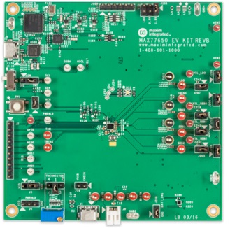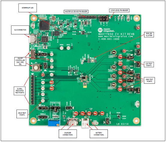 The MAX77650 evaluation kit (EV kit) is a fully assembled and tested printed circuit board (PCB) that demonstrates the MAX77650. The EV kit allows for easy evaluation of the various MAX77650 features, including the SIMO buck-boost regulator, linear regulator, analog multiplexer, smart battery charger, on/off controller, and I2C interface.