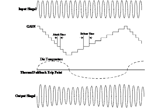 HT862還具有自動(dòng)限溫控制(TFB)功能,在高功率輸出、高環(huán)境溫度等情況下導(dǎo)致芯片片內(nèi)溫度較高時(shí),芯片能自動(dòng)降低系統(tǒng)增益,避免芯片進(jìn)入過(guò)溫關(guān)斷保護(hù)模式,在保證音樂(lè)品質(zhì)的前提下顯著提升音樂(lè)峰值功率,示意圖如下。設(shè)置修改Attack Time和Release Time能適應(yīng)具有不同散熱條件的系統(tǒng)方案。