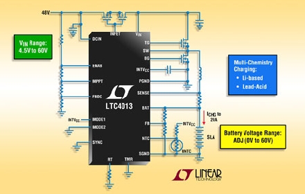 Linear推出高集成度、高壓、適合多種電池化學(xué)組成的同步降壓型電池充電器控制器LTC4013。憑借擴(kuò)展至 60V 的寬輸入電壓范圍,LTC4013 運(yùn)用溫度補(bǔ)償型 3 級和 4 級充電算法,高效地給 12V 和 24V 鉛酸電池充電;蛘,LTC4013 還可以用接近輸入電源的浮置電壓給多節(jié)鋰離子電池所構(gòu)成的電池組充電。該器件采用模式引腳設(shè)定浮置電壓和充電算法。充電電流調(diào)節(jié)準(zhǔn)確度為±5%,可用單個電阻器設(shè)定至高達(dá) 20A (取決于外部組件的選擇)。LTC4013 具用戶可調(diào)的最大功率點(diǎn)跟蹤 (MPPT) 電路,可在使用太陽能電池板等功率受限電源的情況下簡便地實(shí)現(xiàn)功率優(yōu)化。MPPT 開路方法針對電池板溫度變化進(jìn)行校正,沒有因增加太陽能電池板溫度傳感器所帶來的不便。應(yīng)用包括便攜式醫(yī)療儀器、監(jiān)視設(shè)備、電池備份系統(tǒng)、工業(yè)級手持式設(shè)備、工業(yè)照明、軍用設(shè)備、堅(jiān)固耐用型筆記本電腦/平板電腦、以及遠(yuǎn)端供電的通信和遙測系統(tǒng)。