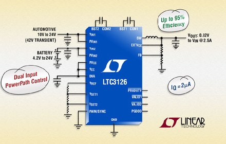 Linear推出2.5A、42V 同步降壓型開(kāi)關(guān)穩(wěn)壓器 LTC3126,該器件集成了雙輸入電源通路 (PowerPath™) 控制。LTC3126 獨(dú)特的電源級(jí)拓?fù)湓试S用兩個(gè)獨(dú)立的電源之一運(yùn)行,輸入之間可無(wú)縫轉(zhuǎn)換且轉(zhuǎn)換是內(nèi)部控制的,以在發(fā)生熱插拔和電源斷接事件時(shí)確保穩(wěn)定的輸出電壓。該器件的內(nèi)部電源開(kāi)關(guān)和同步整流相結(jié)合,可在寬電壓范圍內(nèi)提供 95% 的效率、實(shí)現(xiàn)快速瞬態(tài)響應(yīng)并在以 2MHz 切換時(shí)確保出色的環(huán)路穩(wěn)定性。這就使設(shè)計(jì)師能夠避開(kāi)關(guān)鍵的噪聲敏感頻段 (例如 AM 無(wú)線電頻段),同時(shí)又可提供占板面積非常緊湊的解決方案。LTC3126 的電流模式拓?fù)涫莾?nèi)部補(bǔ)償?shù),從而無(wú)需外部補(bǔ)償組件。突發(fā)模式 (Burst Mode®) 運(yùn)行可在低輸出電流時(shí)保持高效率,同時(shí)保持峰至峰值輸出紋波低于 1%。此外,在無(wú)負(fù)載備用情況下,該器件的靜態(tài)電流低于 2µA,因此非常適合始終保持接通系統(tǒng)和便攜式應(yīng)用。LTC3126 的 2.4V 至 42V 寬輸入范圍和 0.818V 至 VIN 的輸出范圍非常適合汽車應(yīng)用,因?yàn)檫@類應(yīng)用必須穩(wěn)定通過(guò)冷車發(fā)動(dòng)、負(fù)載突降和停-啟情況。其他關(guān)鍵應(yīng)用包括便攜式工業(yè) / 通信測(cè)試設(shè)備、電池和超級(jí)電容器備份電源系統(tǒng)、具電池備份的汽車電源、不間斷電源、由未調(diào)整的墻上適配器供電之系統(tǒng)或大多數(shù)電池化學(xué)組成的單節(jié)至多節(jié)電池組。