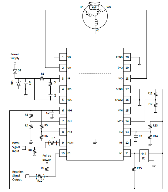圖3.采用一個(gè)霍爾傳感器的LV8811G/13G三相BLDC馬達(dá)驅(qū)動(dòng)電路圖(2)