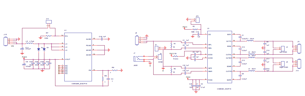 在雙節(jié)鋰電池串聯(lián)的供電情況下,CS5026E配套使用D類功放芯片CS8655實(shí)現(xiàn)2X15W的功率輸出