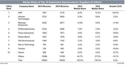 針對(duì)這一市場(chǎng),合并后的新公司將成為重量級(jí)的車用芯片巨擘。而這起收購(gòu)對(duì)于競(jìng)爭(zhēng)對(duì)手又將帶來(lái)多大的沖擊?現(xiàn)在還不得而知,不過(guò),無(wú)疑地,目前在車用市場(chǎng)別排名第四、第五的意法半導(dǎo)體(STMicroelectronics)和德州儀器(Texas Instruments)應(yīng)該會(huì)有所顧慮。