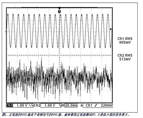 常見的音源,包含音樂和語音,其RMS值往往比峰值輸出功率低得多。通常情況下,語音的峰值與RMS功率之比(即波峰因數)為12dB,而音樂的波峰因數為18dB至20dB。圖1所示為時域內音頻信號和正弦波的波形圖,給出了采用示波器測量兩者RMS值的結果。雖然音頻信號峰值略高于正弦波,但其RMS值大概只有正弦波的一半。同樣,音頻信號可能存在突變,但正如測量結果所示,其平均值仍遠低于正弦波。雖然音頻信號可能具有與正弦波相近的峰值,但在D類放大器表現出來的熱效應卻大大低于正弦波。因此,測量系統(tǒng)的熱性能時,最好使用實際音頻信號而非正弦波作為信號源。如果只能使用正弦波,則所得到的熱性能要比實際系統(tǒng)差。