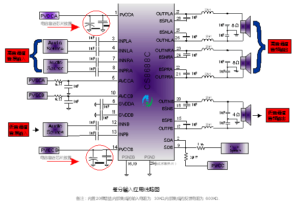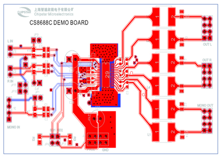 CS8688C內(nèi)置了過流保護(hù),短路保護(hù)和過熱保護(hù),有效的保護(hù)芯片在異常的工作條件下不被損壞。在供電電源小于16.0V的情況下,CS8688C可以驅(qū)動一個4Ω 的低音喇叭和2個8Ω高音喇叭,整體音頻子系統(tǒng)具有高達(dá)90%的效率,使得在播放音樂的時候不需要額外的散熱器。