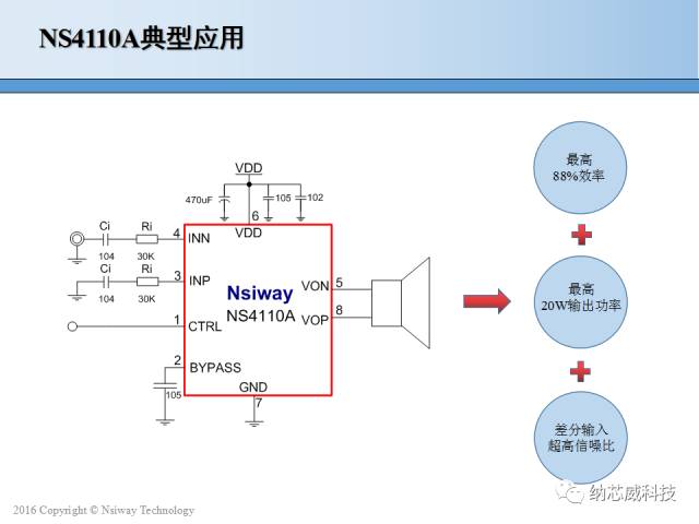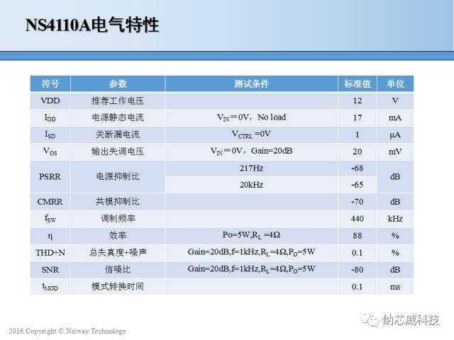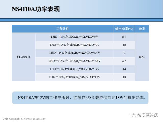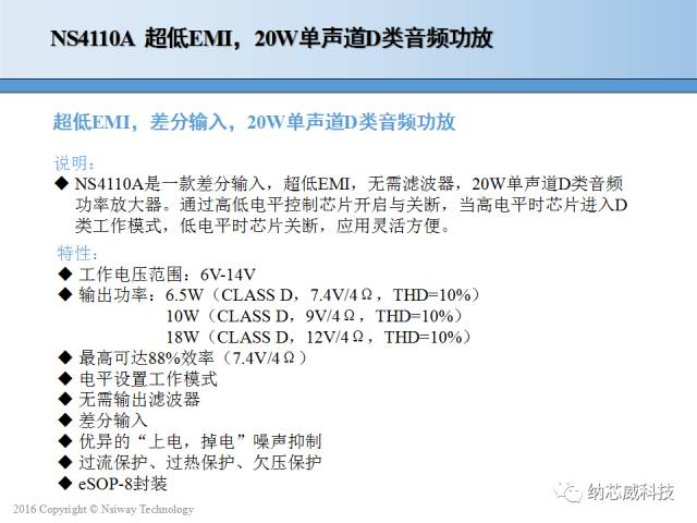 | 納芯威科技全新推出20W單聲道D類音頻功放NS4110A。NS4110A是一款差分輸入,超低EMI,無需濾波器,20W單聲道D類音頻功率放大器。通過高低電平控制芯片開啟與關(guān)斷,當高電平時芯片進入D類工作模式,低電平時芯片關(guān)斷,應用靈活方便。NS4110A 采用先進的技術(shù),在全帶寬范圍內(nèi)極大地降低了 EMI 干擾,最大限度地減少了對其他外部元件的影響。其輸出無需濾波器的 PWM 調(diào)制結(jié)構(gòu)減少了外部元件、PCB面積和系統(tǒng)成本。NS4110A在12V的工作電壓時,能夠向4Ω負載提供高達18W的輸出功率,88%以上的效率更加適合便攜式音頻系統(tǒng)。