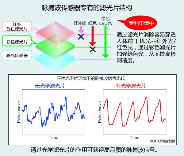 “BH1790GLC”利用ROHM的傳感器技術(shù)優(yōu)勢(shì),采用非常適合脈搏檢測(cè)的符合綠色光波長(zhǎng)的光電二極管,同時(shí)感光部采用綠色光的濾光片和紅外(IR)截止濾光片相結(jié)合的脈搏傳感器專有的濾光片結(jié)構(gòu)。因此,
