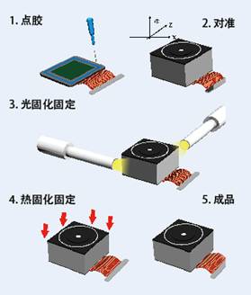 2 、 Dymax 戴馬斯的新技術(shù): 低溫?zé)峁袒夹g(shù),主要應(yīng)用于攝像頭組裝的主動對焦制程 (Active Alignment) 膠粘劑中。攝像頭的鏡座與電路板組裝過程中引進(jìn)主動對焦制程可有效解決產(chǎn)品良率的問題。用于確定鏡頭和濾光鏡片之間的最佳位置,使鏡頭在整個圖像平面將產(chǎn)生最佳聚焦的質(zhì)量。在使用光固化零部件之前,先對鏡頭進(jìn)行三維調(diào)整,測量最佳位置,再通過光照和加熱完成最終的固化。