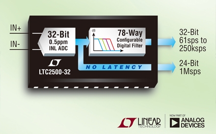 Linear的亞德諾半導(dǎo)體 (Analog Devices, Inc.,簡稱ADI) 宣布推出LTC2500-32,這是一款超高精確度的 32 位逐次逼近寄存器型 (SAR) 模數(shù)轉(zhuǎn)換器 (ADC)。LTC2500-32 是一種面向精準測量應(yīng)用的新型和可行方法,該器件把凌力爾特專有 SAR ADC 架構(gòu)的高準確度和速度與靈活的集成化數(shù)字濾波器相整合,以優(yōu)化系統(tǒng)信號帶寬并放寬模擬抗混疊濾波器要求。LTC2500-32 同時提供兩個輸出:(1) 一個經(jīng)過數(shù)字濾波的 32 位低噪聲輸出,該輸出實現(xiàn)了高達 148dB 的動態(tài)范圍;(2) 一個 32 位 1Msps 無延遲輸出,該輸出由一個超范圍檢測位、一個表示輸入電壓差的 24 位代碼和一個表示共模輸入電壓的 7 位代碼組成。無延遲輸出在本質(zhì)上與數(shù)字濾波輸出是完美匹配的,從而在那些需要使用一個附加較快速的 ADC與一個精準 ADC 并行以監(jiān)視信號完整性的應(yīng)用中,消除了常見的失配和漂移問題。寬輸入共模范圍和高 CMRR 使 LTC2500-32 能夠連接共模電壓不斷變化的信號,從而簡化了模擬信號鏈。兩個輸出每個都可高度準確地表示加在兩個輸入端子之間的電壓差。