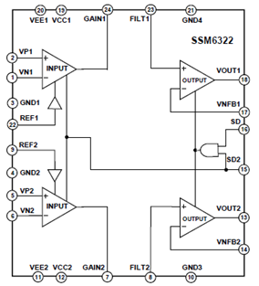 The SSM6322 is available in a 24-lead LFCSP package. TheSSM6322 operates over the industrial temperature of −40℃ to+85℃.