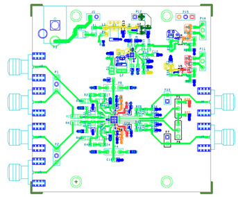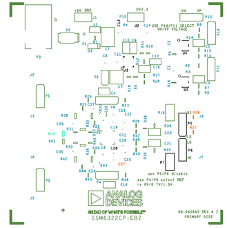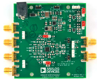 The SSM6322 evaluation board, the SSM6322CP-EBZ, evaluates the SSM6322, which is offered in a 24-lead LFCSP package. The SSM6322CP-EBZ evaluation board is a 4-layer printed circuit board (PCB) designed to quickly evaluate the performance of the device and reduce design time. The SSM6322CP-EBZ accepts SMA edge mounted connectors to test equipment or other circuitry.