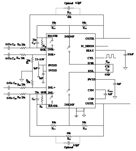 輸入電容CIN,輸入電阻RIN,反饋電阻RF應(yīng)盡可能使用高精度器件,以使芯片發(fā)揮更優(yōu)秀的失真、信噪比等性能。