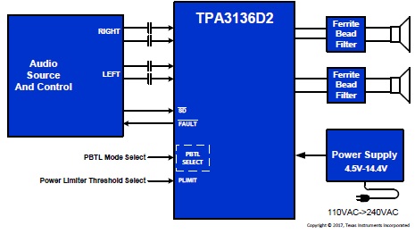借助采用擴(kuò)展頻譜控制方案的高級(jí) EMI 抑制技術(shù),既能實(shí)現(xiàn)在輸出端使用成本較低的鐵氧體磁珠濾波器,同時(shí)能夠滿足 EMC 要求,降低了系統(tǒng)成本。TPA3136D2/TPA3136AD2 器件不僅針對(duì)短路和過載提供全面的保護(hù),而且 SpeakerGuard™揚(yáng)聲器保護(hù)電路包括一個(gè)功率限制器和一個(gè)直流檢測(cè)電路,可以保護(hù)所連接的揚(yáng)聲器。直流檢測(cè)及引腳至引腳、引腳接地和引腳至電源短路保護(hù)電路可以防止揚(yáng)聲器在生產(chǎn)過程中發(fā)生輸出直流和引腳短路。同時(shí)充分保護(hù)輸出,防止 GND、PVCC、輸出至輸出短路。短路保護(hù)和熱保護(hù)具有自動(dòng)恢復(fù)功能。