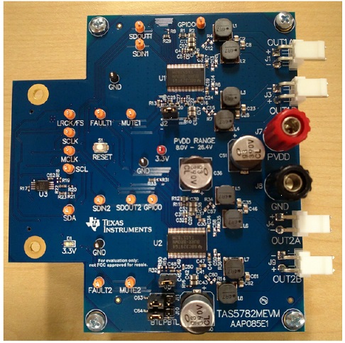 The TAS5782MEVM showcases the latest TI digital input class-D closed loop amplifier. The TAS5782M isan I2S or TDM input class-D amplifier with up to 96-kHz processing. The EVM is used in conjunction withthe PPCMB. The PVDD supply is provided via the TAS5782MEVM and is regulated to 5 VDC and 3.3VDC on the PPCMB. The PPCMB provides the I2S, I2C, and 3.3 VDC to the TAS5782MEVM.