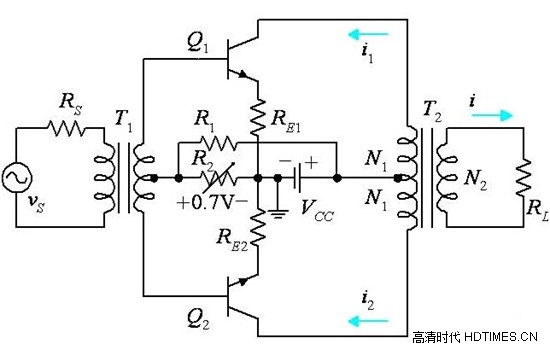 AB類功率放大器(Class AB)也成為甲乙類功率放大器,它是兼容A類與B類功放的優(yōu)勢的一種設(shè)計。當(dāng)沒有信號或信號非常小時,晶體管的正負(fù)通道都常開,這時功率有所損耗,但沒有A類功放嚴(yán)重。當(dāng)信號是正相時,負(fù)相通道在信號變強(qiáng)前還是常開的,但信號轉(zhuǎn)強(qiáng)則負(fù)通道關(guān)閉。當(dāng)信號是負(fù)相時,正負(fù)通道的工作剛好相反。