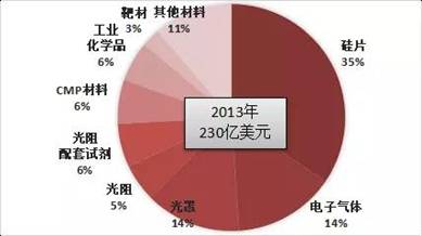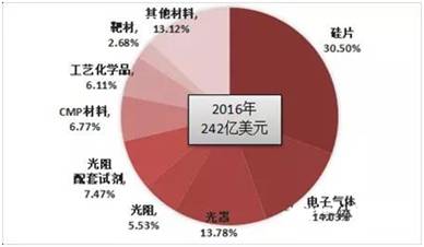 半導(dǎo)體晶圓制造材料和晶圓制造產(chǎn)能密不可分,近年隨著出貨片數(shù)成長,半導(dǎo)體制造材料營收也由2013年230億美元成長到2016年的242億美元,年復(fù)合成長率約1.8%。從細(xì)項中可看出硅晶圓銷售占比由2013年35%降到2016年的30%。
