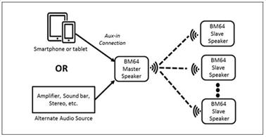 圖示1-基于Microchip IS2064GM一拖多藍(lán)牙音頻解決方案的系統(tǒng)方案圖